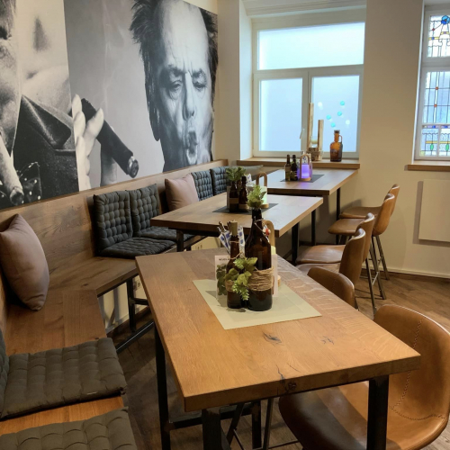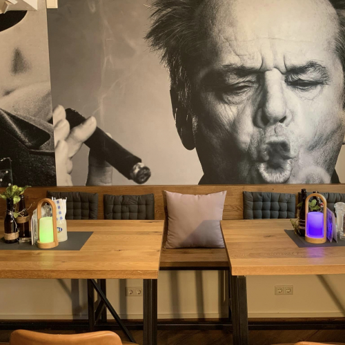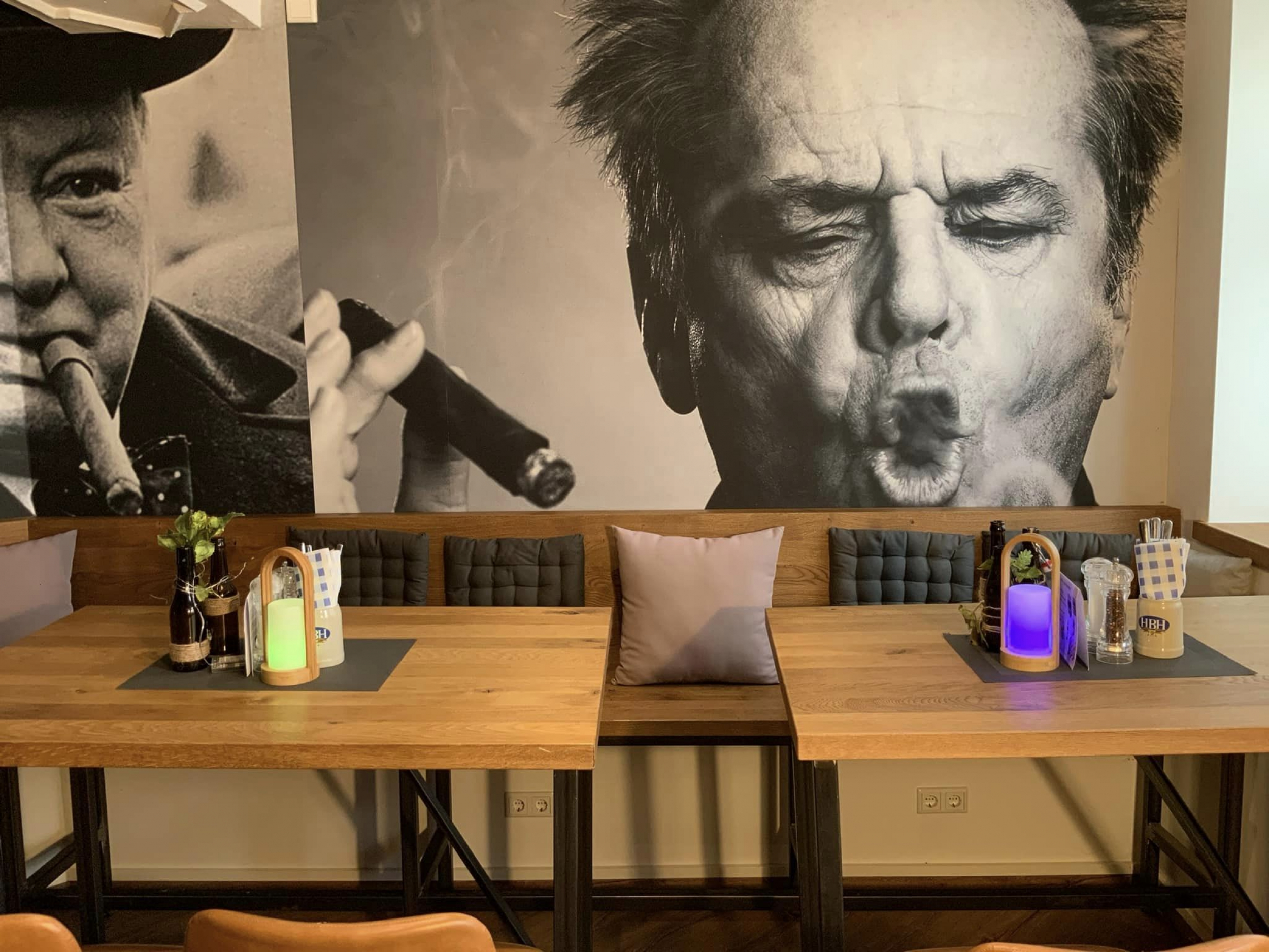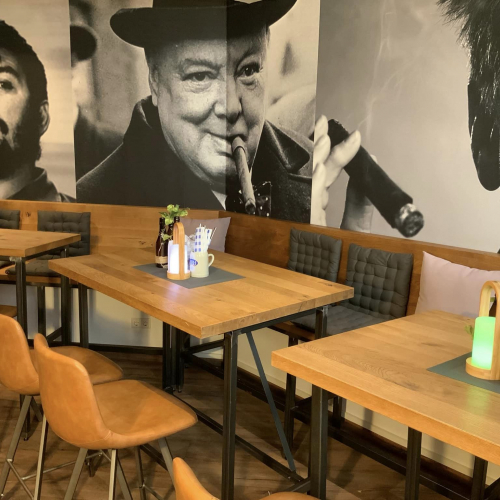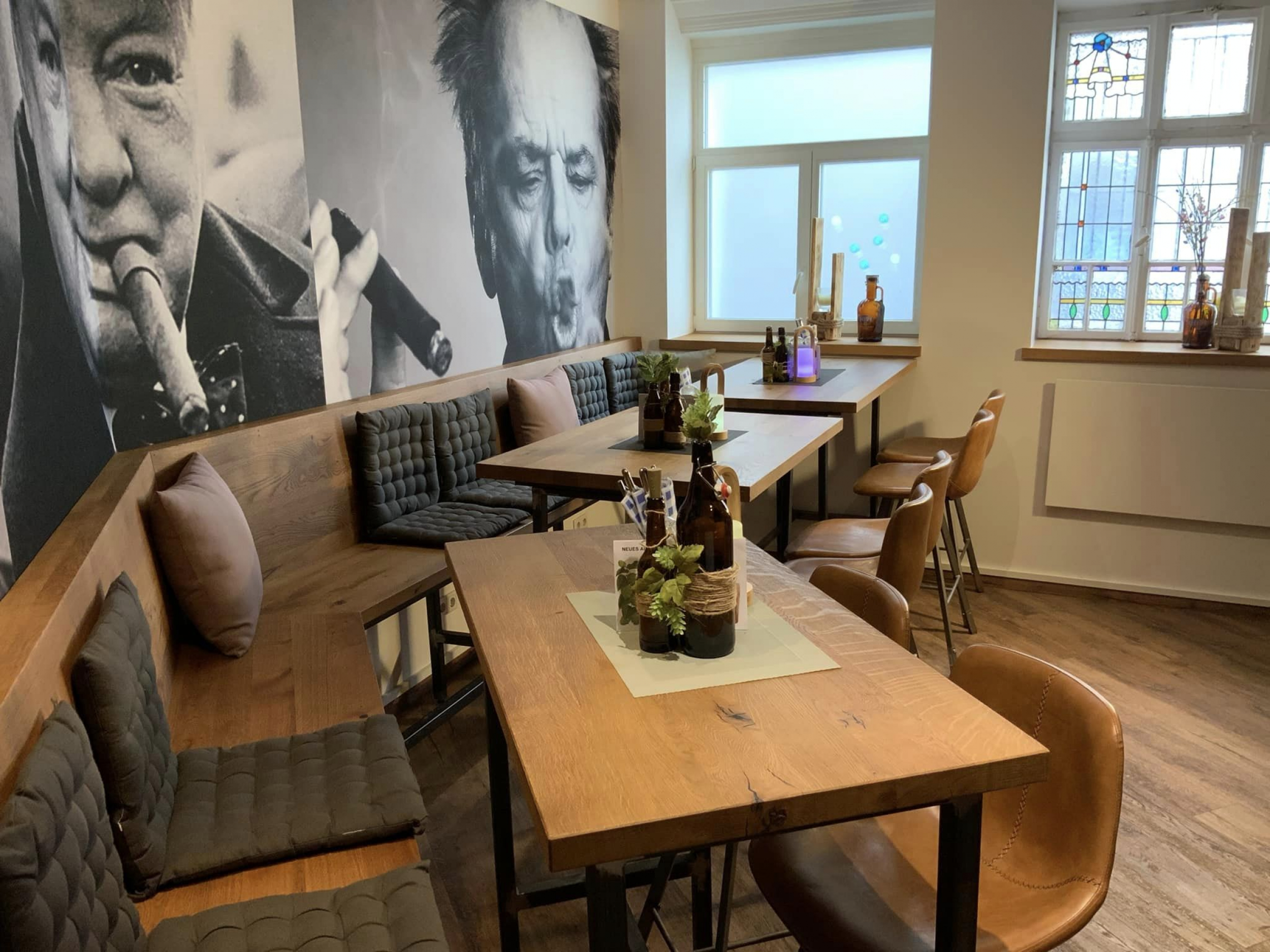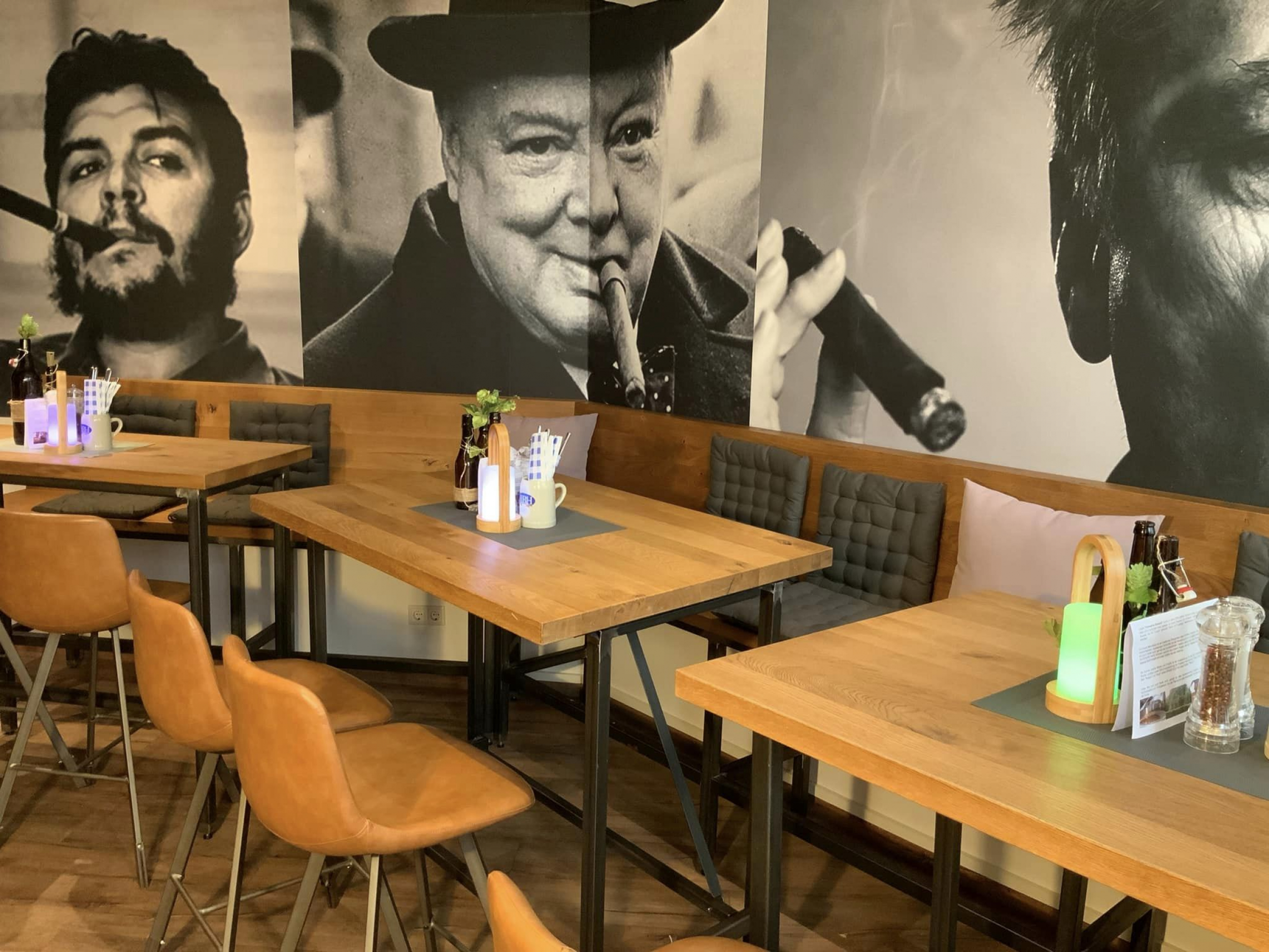 Der Parkettboden in Holzoptik, Zigarrenmotive an der Wand und die Fensterfront schaffen ein gemütliches und modernes Ambiente. Durch seine abgetrennte Lage zu den größeren Räumlichkeiten, ist man hier eher unter sich. Ausgestattet ist der separate Raum mit Hochtischen und -stühlen, dieser kann gegen eine Raummiete exklusiv gebucht werden.